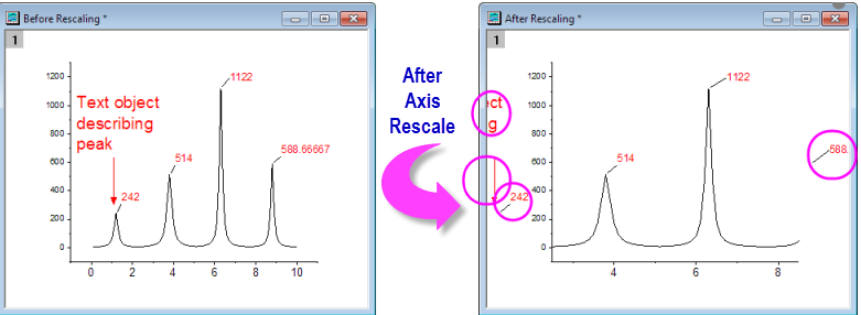 当你在图形中添加文本标签和绘图对象后,重设坐标轴范围,可以是通过在改变 坐标轴 对话框中 刻度 选项卡下的 起始 和 结束 的值来修改,也可以是使用在工具栏中的 放大 工具来修改。你可能会发现,下图中在坐标轴范围外的一些注释也被显示出来。而且这个问题将会延伸到所有导出或嵌入的图形,例如,将图形插入到 MS Office? 文档也会出现这种情况。