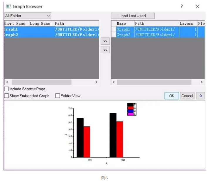 Graphs→选中Graph1和2,并点击>>,OK(如图8)Number of Rows→ 填写1Number of Columns→ 填写1最后填写结果如图7 作者:科学指南针 https://www.bilibili.com/read/cv7531358?from=search&spm_id_from=333.337.0.0 出处:bilibili